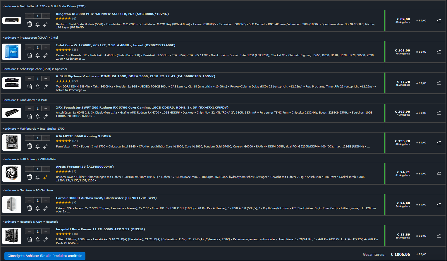 - SSD: Samsung SSD 980 1TB ODER Kingston NV2 NVMe PCIe 4.0 SSD 1TB, M.2
