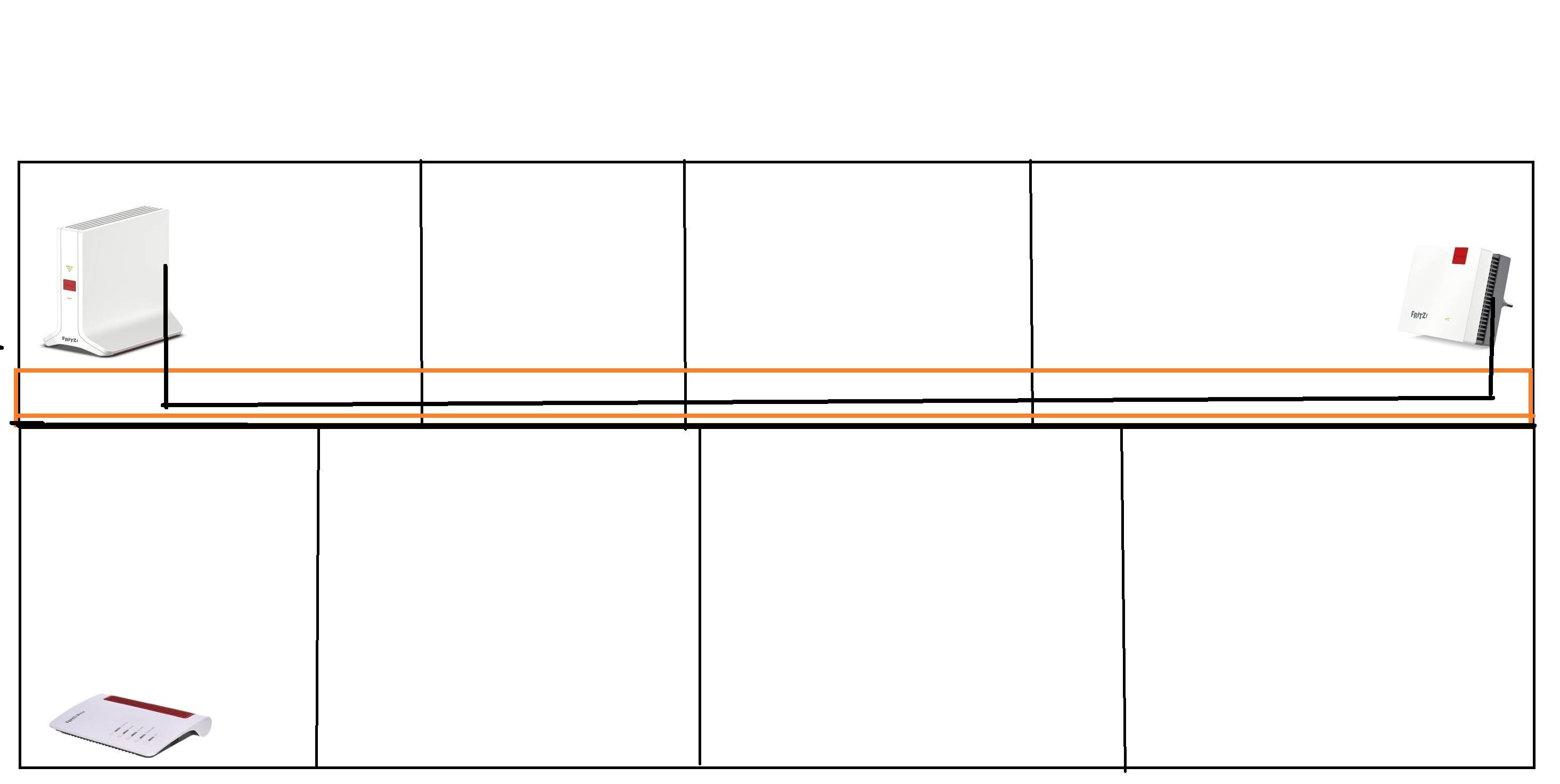 Lankabel über die enge aber begehbare Abseite (orange auf der Skizze) von der 3000 AX zu dem Zimmer oben rechts. Dort Anschluss an einen vorhandenen Switch und ein Fritz!Repeater 1200 AX um für Wlan in der Umgebung zu sorgen.