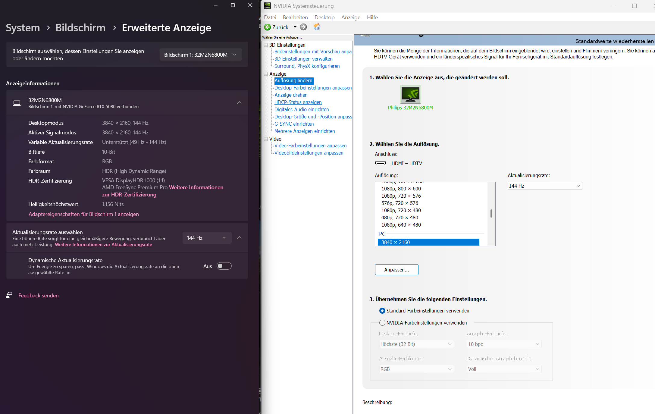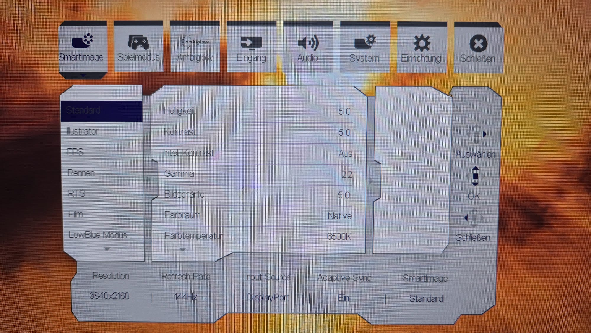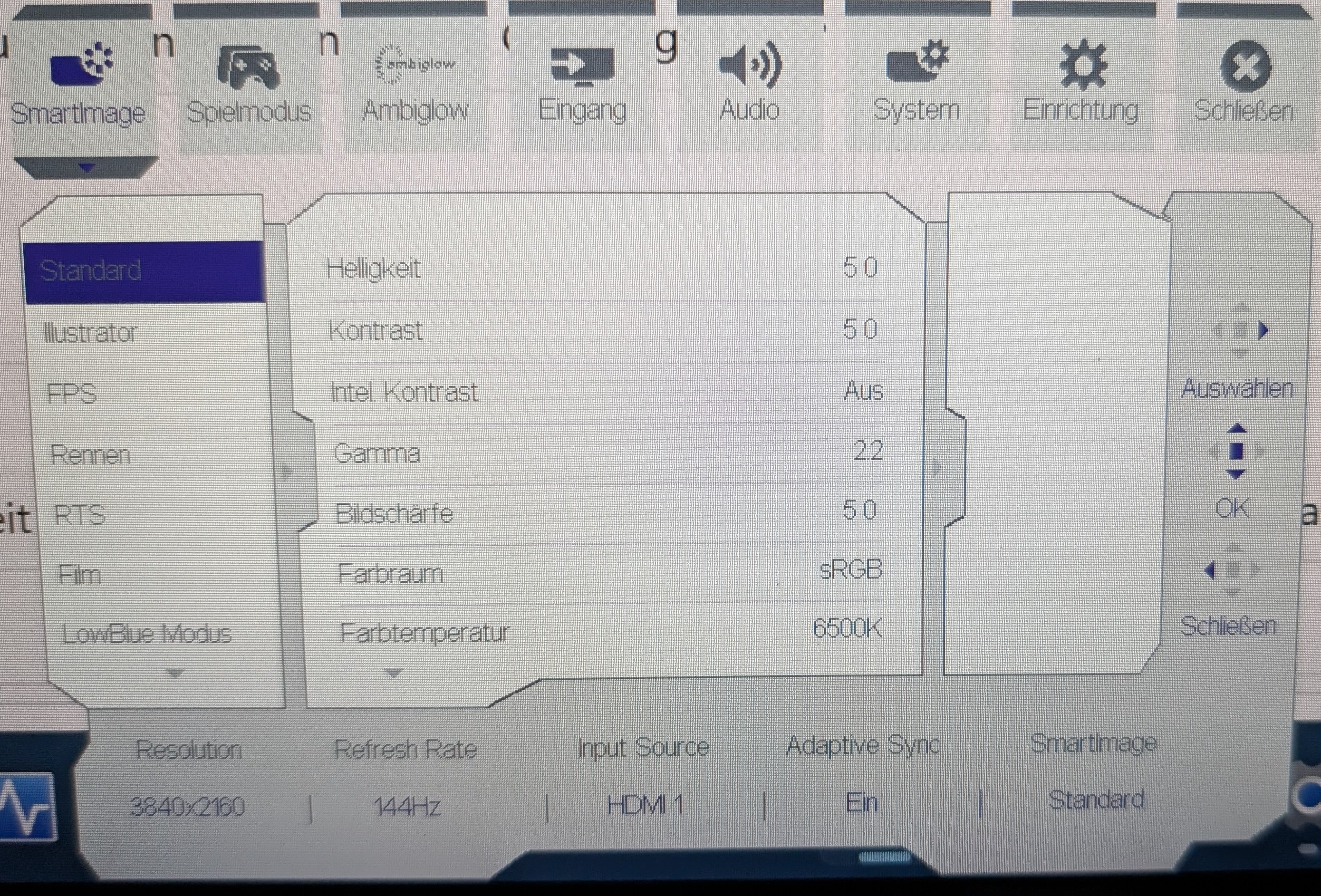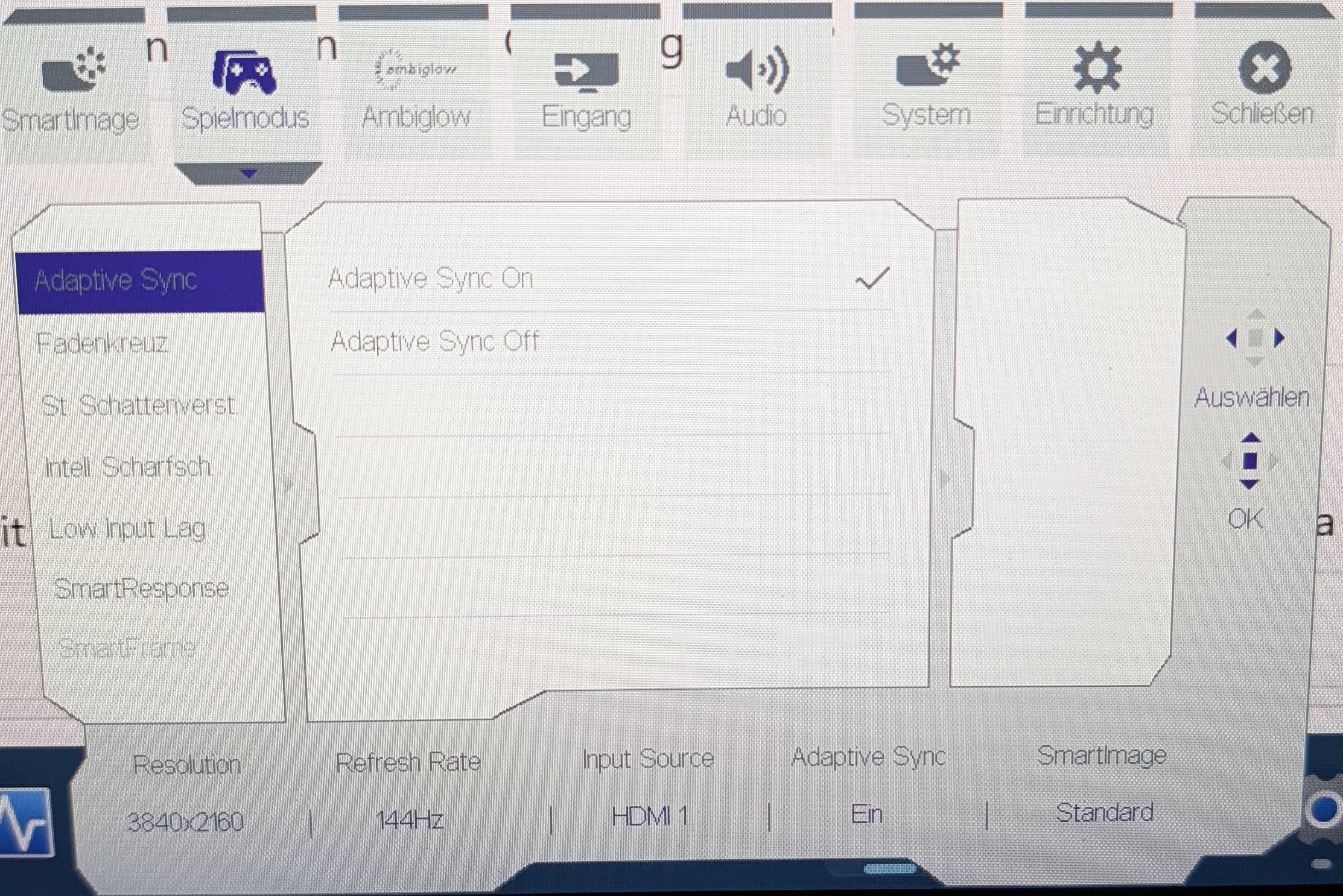 Adaptive Sync habe ich an, angeschlossen über Diplay Port, Local Dimming ist im SDR Modus aus.