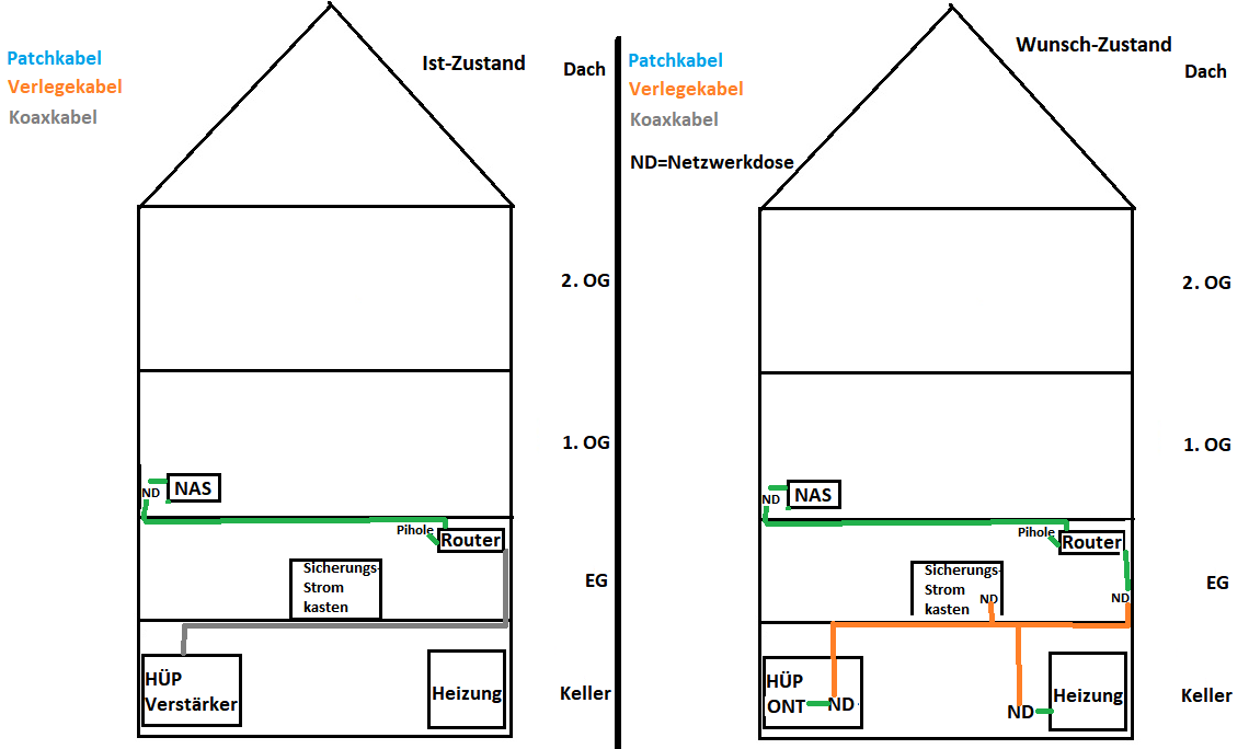 ich bin gerade überfordert mit der Hausverkabelung. Umfangreiche Verlegearbeiten sind derzeit nicht möglich. Der Wunsch-Zustand wäre dann für paar Jahre vorgesehen.