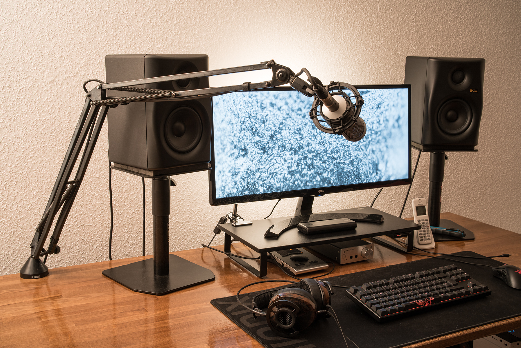 Das hier sehe ich effektiv, wenn ich am Rechner sitze und das Mikro seitlich in etwa 15cm Abstand auf meinen Mund richte. Das Sichtfeld auf den 21:9(!) Monitor wird nicht verdeckt. Die Soundquali ist deutlich besser, als wenn ich das Mikro direkt vor / hinter / neben die Tastatur stelle.