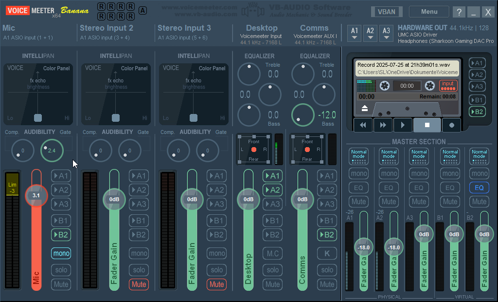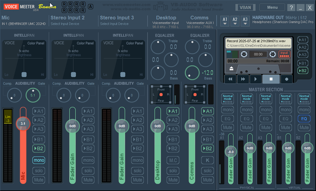 Hierzu muss ich jedoch auch erwähnen, dass das Handling des Interfaces für unerfahrene User am Anfang etwas frustrierend sein kann wenn man die Windows-Mittel verwendet. Der Haken ist, dass man keine Kontrolle über das Mono-Signal hat und sich zBsp. nur auf einer Seite abhört - oder eben die Gesprächspartner. Das Interface ist technisch einwandfrei, genau wie die Treiber, aber Behringer spart sich an dieser Stelle eine vernünftige Software, sodass man auf eine andere ausweichen muss. Für mich ist das VoiceMeeter Banana. Man muss sich da ein klein wenig einlesen und den Signalweg verstehen, heißt, auch wenn er digital ist, muss in deinem Kopf quasi ein roter Faden von Eingabe bis Ausgabe vorhanden sein.