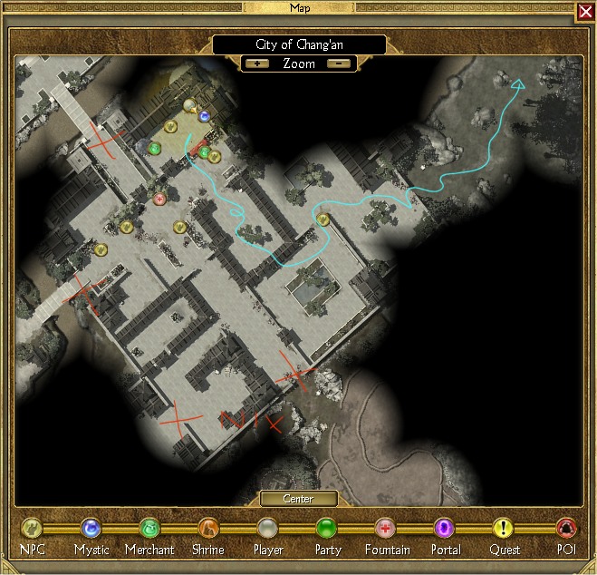Im Nordosten der Stadt gehts weiter, da steht ein Typ mit einem ! herum, der dir die Tür zum Wusao Berg öffnet und sich danach pensionieren lassen will. Durch die Türen im Süden der Stadt musst du eigentlich nie, nach dem Gelben Kaiser (oder wie auch immer der heißt) kann man sich direkt in die Stadt teleportieren.