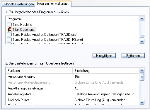 Manchmal hilft auch ein Neustart des PC´s bzw. Du legst noch einmal ein neues Profil für TQ an und löschst das alte, sofern vorhanden. Unter Umständen hakt da momentan etwas. Das Control Panel ist eh noch etwas buggy. Stelle ich manuell z.B. AA in einem Profil X ein, passiert es oft, dass beim nächsten Besuch des Control Panels dort wieder etwas ganz anderes steht. Man kann sich eben nicht darauf verlassen, dass auch alle gewünschten Einstellungen beim 1. Mal auch gleich übernommen werden. Ich muss dazu oftmals mehrmals alles einstellen, bis es stimmt. Das ist ziemlich nervig, wenn man einen neuen nVidia-Treiber installiert hat und alle Profile neu erstellen muss.