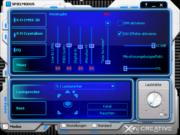 Ich habe mir heite die Crative X-Fi Titanium zugelegt. Mir wurde gesagt, dass ich die Lautstärke jedes Lautsprechers eigens einstellen kann. Ich brauche dieses Feature unbedingt, finde es aber leider nicht. Treiber ist der aktuellste (Auto-Updater).