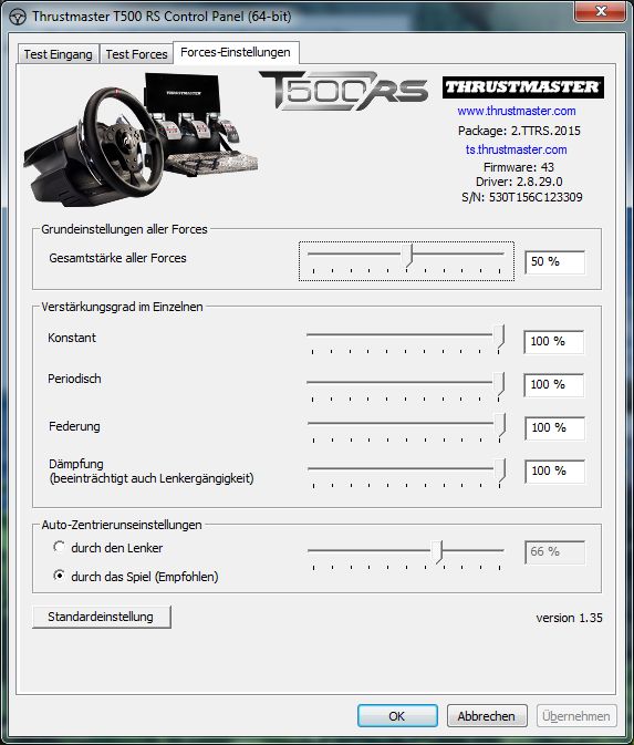 Mein neues T500 RS scheint ein leichtes Problem mit der Zentrierung zu haben. Konkret: Es bleibt nicht auf der exakten Nullstellung stehen, sondern dreht sich ein paar Grad weiter nach rechts. Wenn ich gegen den Widerstand drücke und es in die richtige Nullstellung drehe, zeigt auch der Treiber korrekt die Nullstellung an. Lässt man es los, dreht es sich wieder leicht zurück nach rechts. Bedeutet also konkret, dass ein Auto immer ganz leicht nach rechts zieht, wenn man das Lenkrad loslässt. Das ist jetzt nicht die Welt, stört mich aber schon bei einem Wheel, das nun auch kein Schnäppchen ist. Neueste Treiber und Firmware sind drauf. Hat jemand ne Idee was man da tun kann? Danke!