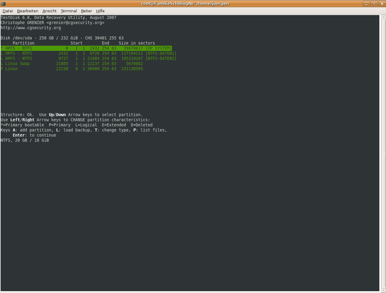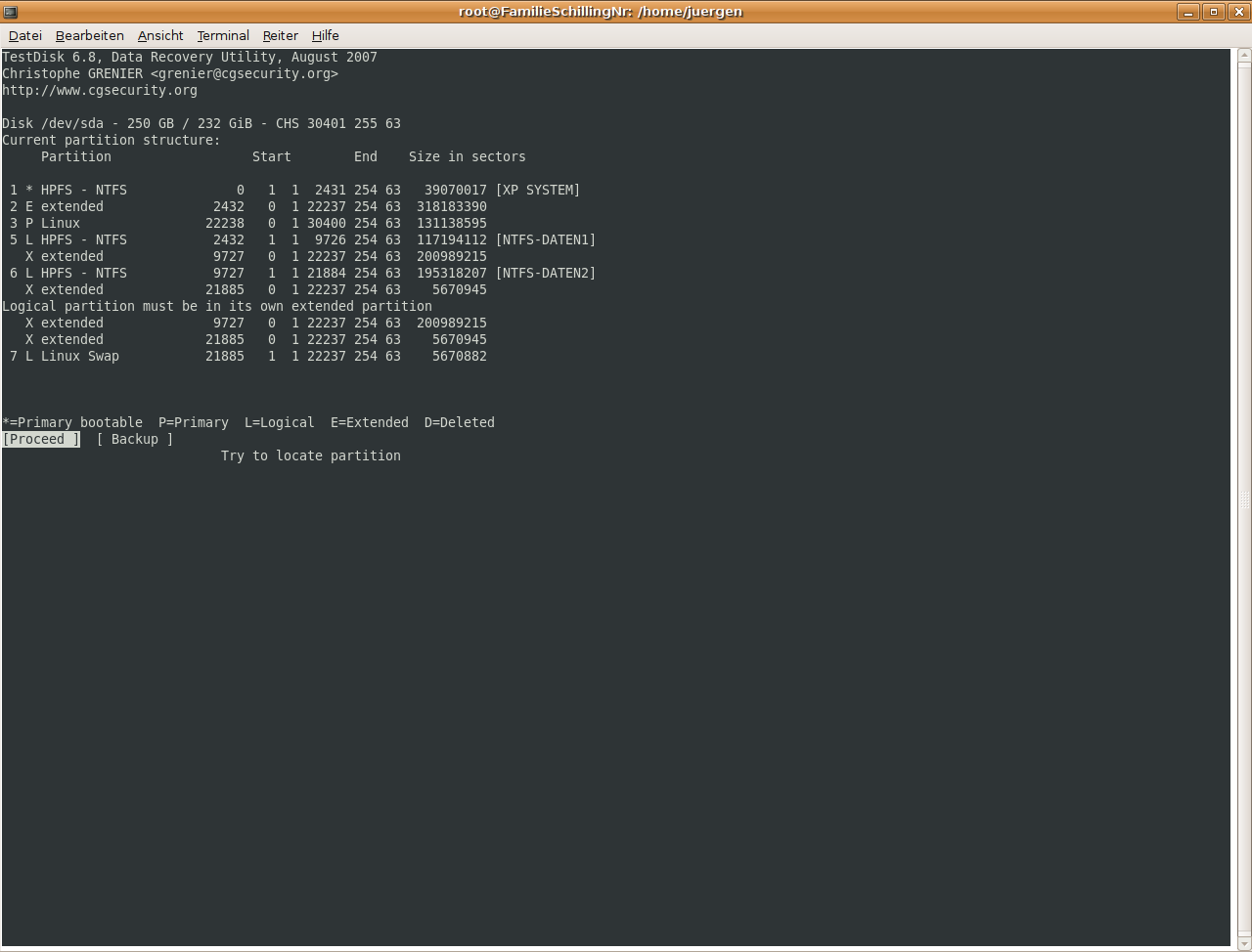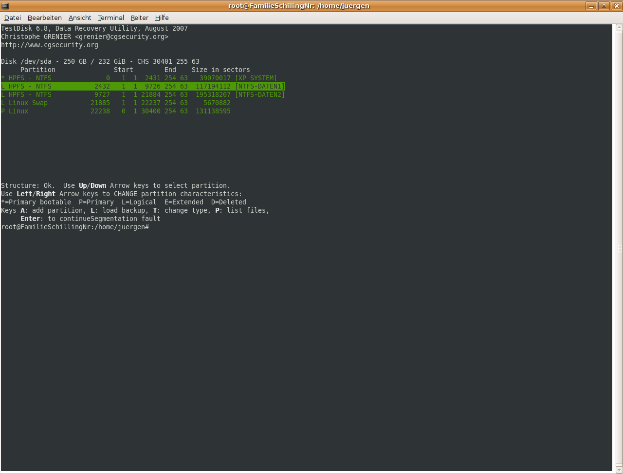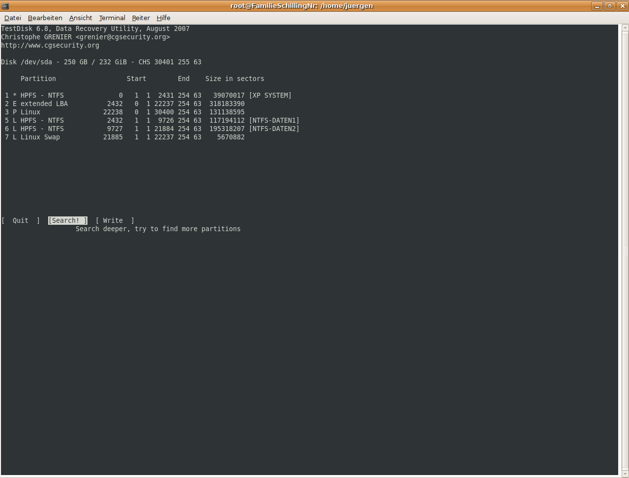 Ich hab` dann über die Paketverwaltung wohl die Version 6.8 (eine neuere gab es nicht) installiert und damit auch Testdisk zum Laufen gebracht, aber: