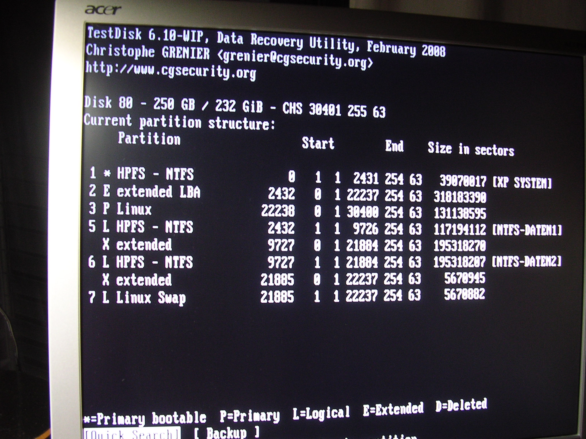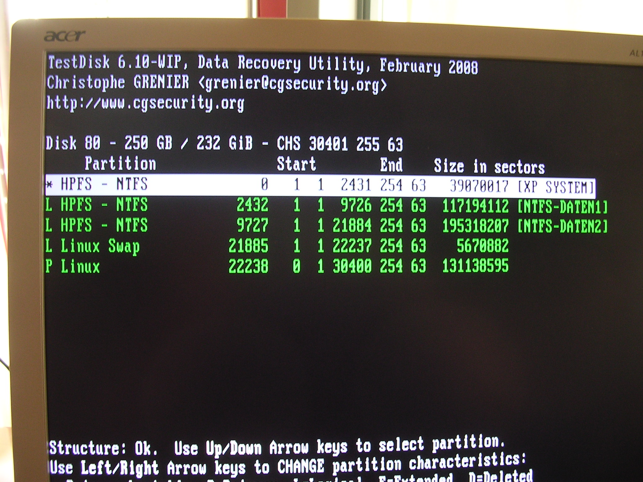 Also hab` ich versucht, unter Ubuntu Testdisk zu laden, was erstmal nicht gelang, weil die Datei "testdisk-6.9.linux26.tar.bz2" partout nicht zu öffnen war (ich bin nicht gerade der Linux-Crack).