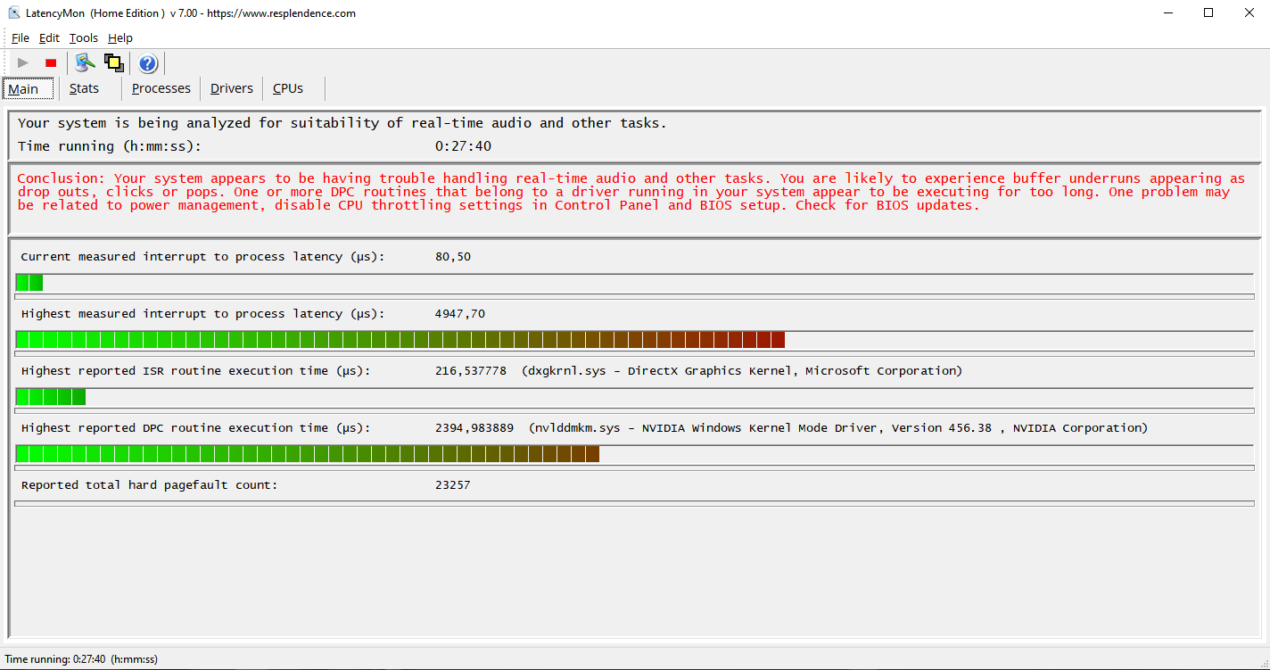 ich habe das lästige Problem, dass der Ingame Sound kurzerzeit in verschiedenen Abständen sich verabschiedet. Darunter erleide ich keine Framedrops. Bei Musik oder Streaming diensten habe ich das Problem allerdings nicht. Ich habe gestern versucht diverse USB verbindungen abzustecken um sicher zu sein das es was damit zu tun hat. Ich habe alle Soundtreiber deinstalliert und neuinstalliert (Headset, Realtek), den Energiesparplan auf Höchstleistung gestellt. Ich habe mir zusätzlich das Programm "LatencyMon" zugelegt um zu schauen welche Programme für dieses Problem zuständig sind. An erster Stelle war es "dxgkrnl.sys" und als zweites "nvlddmkm.sys". Ich weiß einfach nicht mehr weiter und möchte bei den Spielen den Ton einwandfrei haben.
