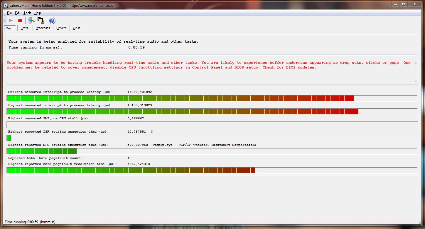 DPC Latency Checker zeigt an, dass dein Rechner Probleme hat. Die Wahrscheinlichkeit ist hoch, dass diese auch die Ursache für die fehlerhafte Audiowiedergabe sind.