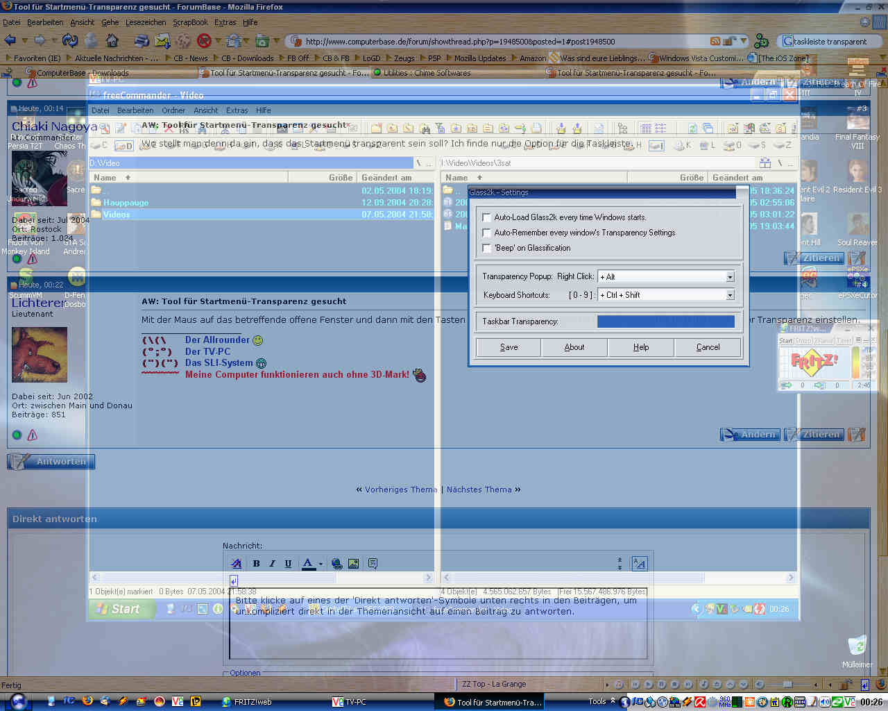 wie der Titel schon sagt, suche ich ein Tool, dass das Startmenü von Windows XP transparent/durchsichtig macht. Dabei sollte es sich konfigurieren lassen wie stark die Transparenz sein sollte.