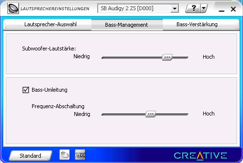 Hört sich für mich schwer nach ner analogen 5.1 Anlage an einer Audigy an. Mag natürlich sein, dass ich mich irre, aber wenn dem so wäre, bekommst Du was aus dem Subwoofer, wenn Du die Bassumleitung (s. Screenshot) aktivierst.