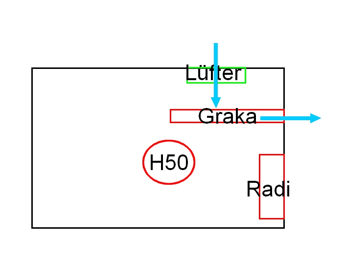Meiner Einschätzung nach würde es vielleicht ebenfalls Sinn machen, wenn ich mittels des 140er Lüfters die warme Luft der Grafikkarten (wobei die GT520 - keline oben - nur fürs BluRay schauen am Beamer genutzt wird) nach unten Drücke um diese dann mittels des Frontlüfters und des NTs (befinden sich über/untereinander nach draußen befördere.