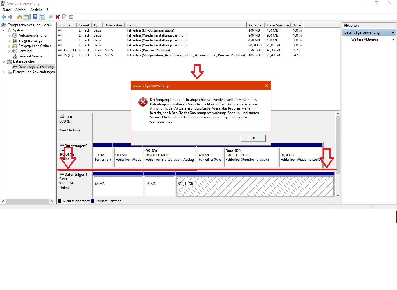 Im Versuch, den Laufwerkbuchstaben zu ändern, bzw. der Festplatte einen Buchstaben zu zuweisen, erschien immer die selbe Fehlermeldung (siehe Bild).