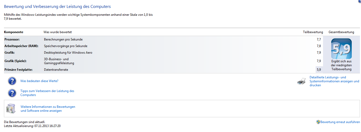 Was mich insbesondere stört sind weniger die Werte beim Benchmark, (wobei ich mich da auch nicht genug auskenne, um sagen zu können ob sie so passen, meine Intuition nach aber schon) sondern den Wert welchen Windows mir anzeigt, der bei solche Schreib/Lesegeschwindigkeiten ja eigentlich bei 7,9 (?) liegen müsste.