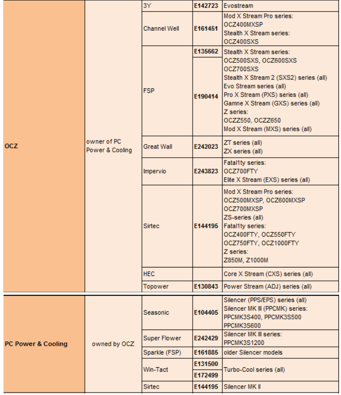 Wie Du siehst, kommen als Fertiger der Netzteile von OCZ und seiner Tochter PC Power & Cooling eine ganze Menge Firmen in Betracht: