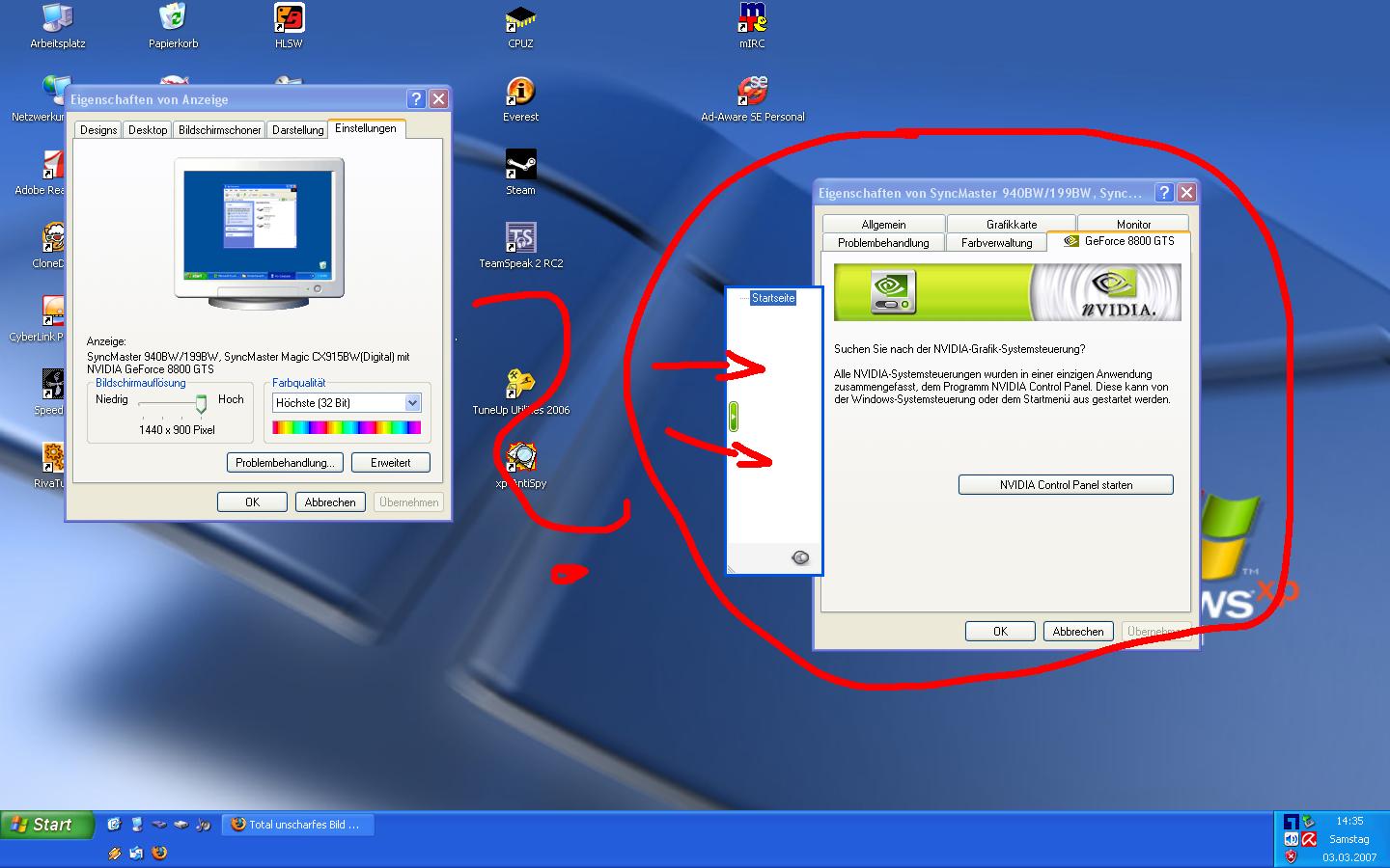 ich habe grade meine neue Graka bekommen. Eingebaut, Treiber installiert (neuster der Nvidia Page) und dann neugestartet doch nun ist mein Bild so derbe unscharf. Was kann ich tun? gibt es andere treiber die ihr mir empfehlt?`Ich habe einen Samsung SyncM 940BW mit 1440*900, welche ich auch eingestellt habe aber das bild ist so unscharf das ich Kopfschmerzen davon bekomme. Und wie stelle ich das Treibermenü auf die KLassische ansicht um?