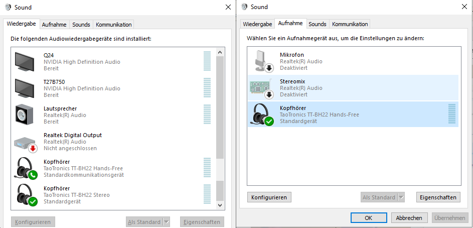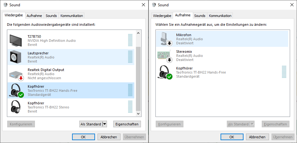 Nun das eigenartigste: wenn ich jetzt im LoL-Sprachchat bin, mein Headset kein Ton mehr rausgibt aber ich die "TaoTronics.... HANDS-FREE" auch als Standardgerät für den Sound aktiviere (zusätzlich zum "Standardkommunikationsgerät"), kann ich wieder alles hören.