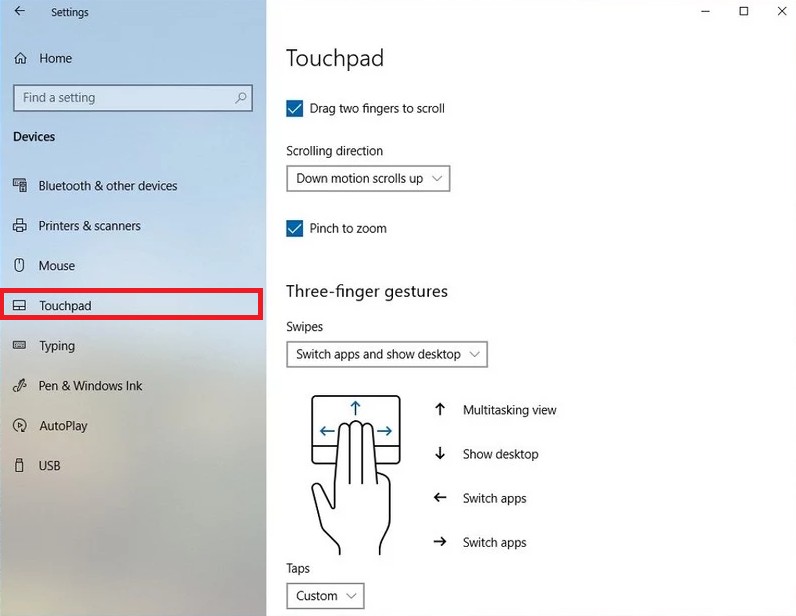 Unter Start -> Einstellungen -> Geräte fehlt der Eintrag Touchpad komplett.