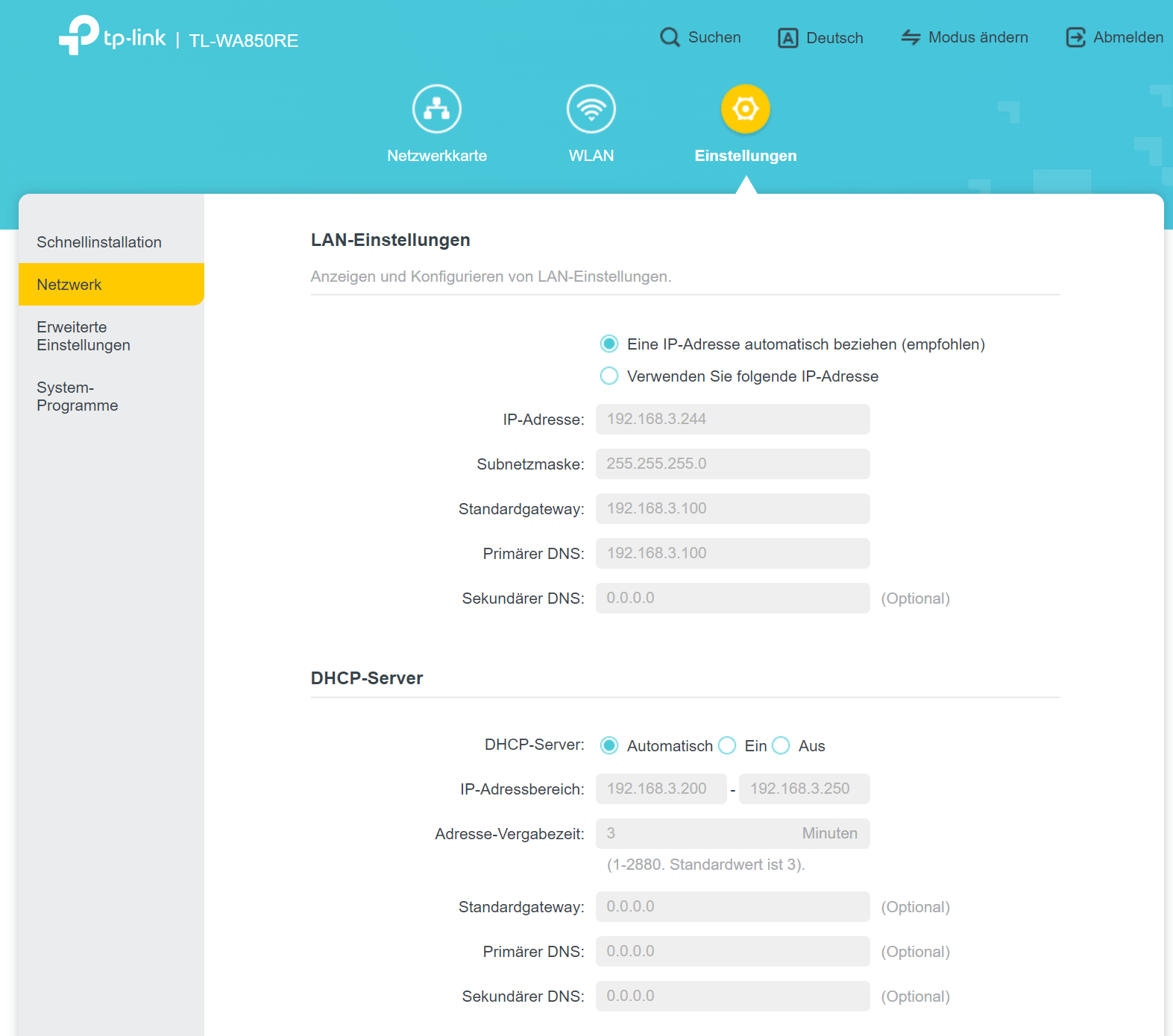 Hier unbedingt den DHCP-Server von „Automatisch“ auf „Aus“ ändern, Begründung siehe