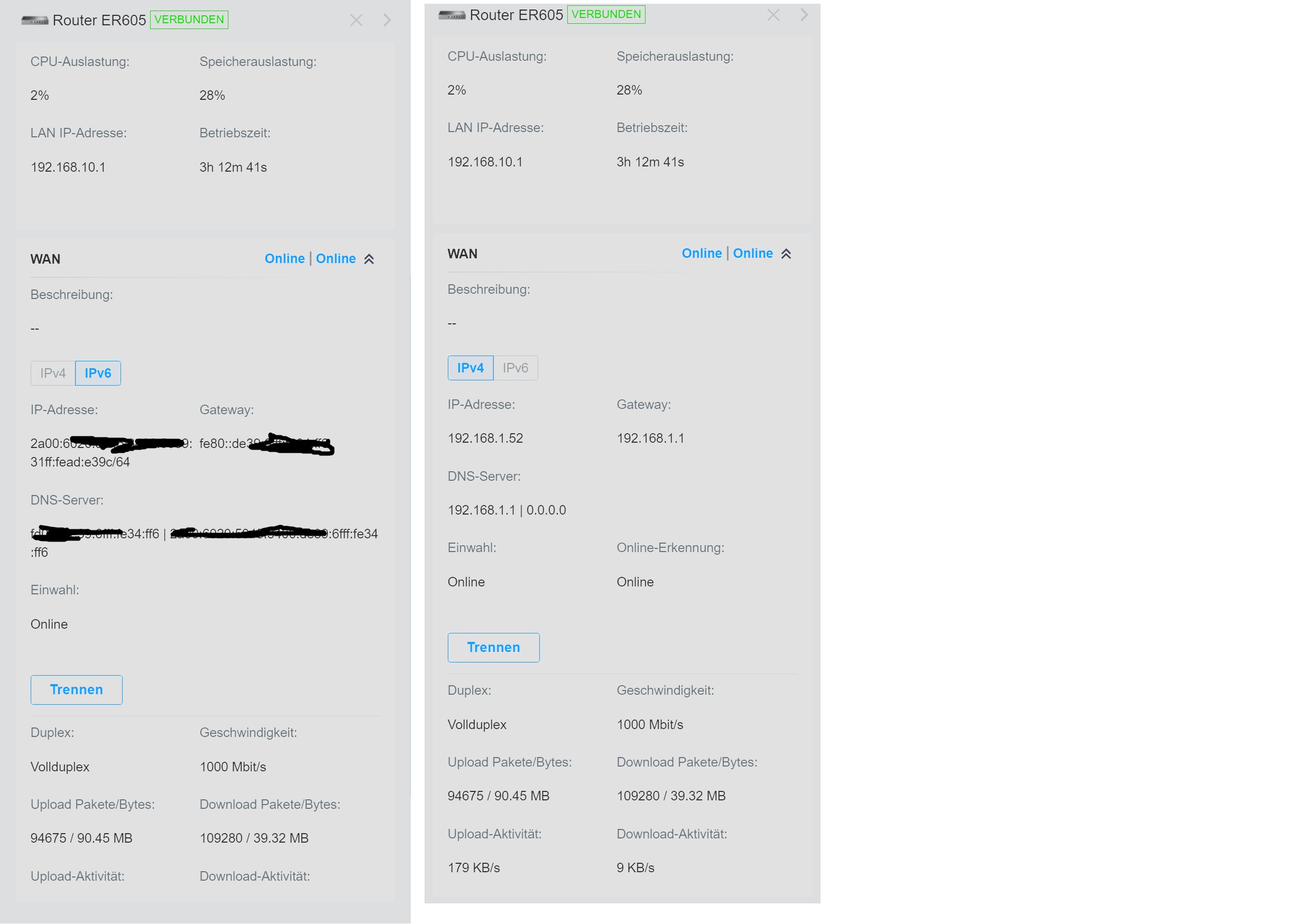 Nun zu meinen Problemen: habe ein openvpn VPN eingerichet, dieser ist allerdings nur über die ipv4 erreichbar (vom Netzwerk der Fritzbox aus), die er von der Fritzbox bekommt. Sobald ich von z.B. meinem Smartphone, mit der ipv6 des ER605 teste, findet er keine Verbindung. Kann der Router nicht mit der ipv6 umgehen? kann ich mir nicht vorstellen, denn er verteilt auch an die Clients eine öffentlich ipv6 aus dem Präfix.