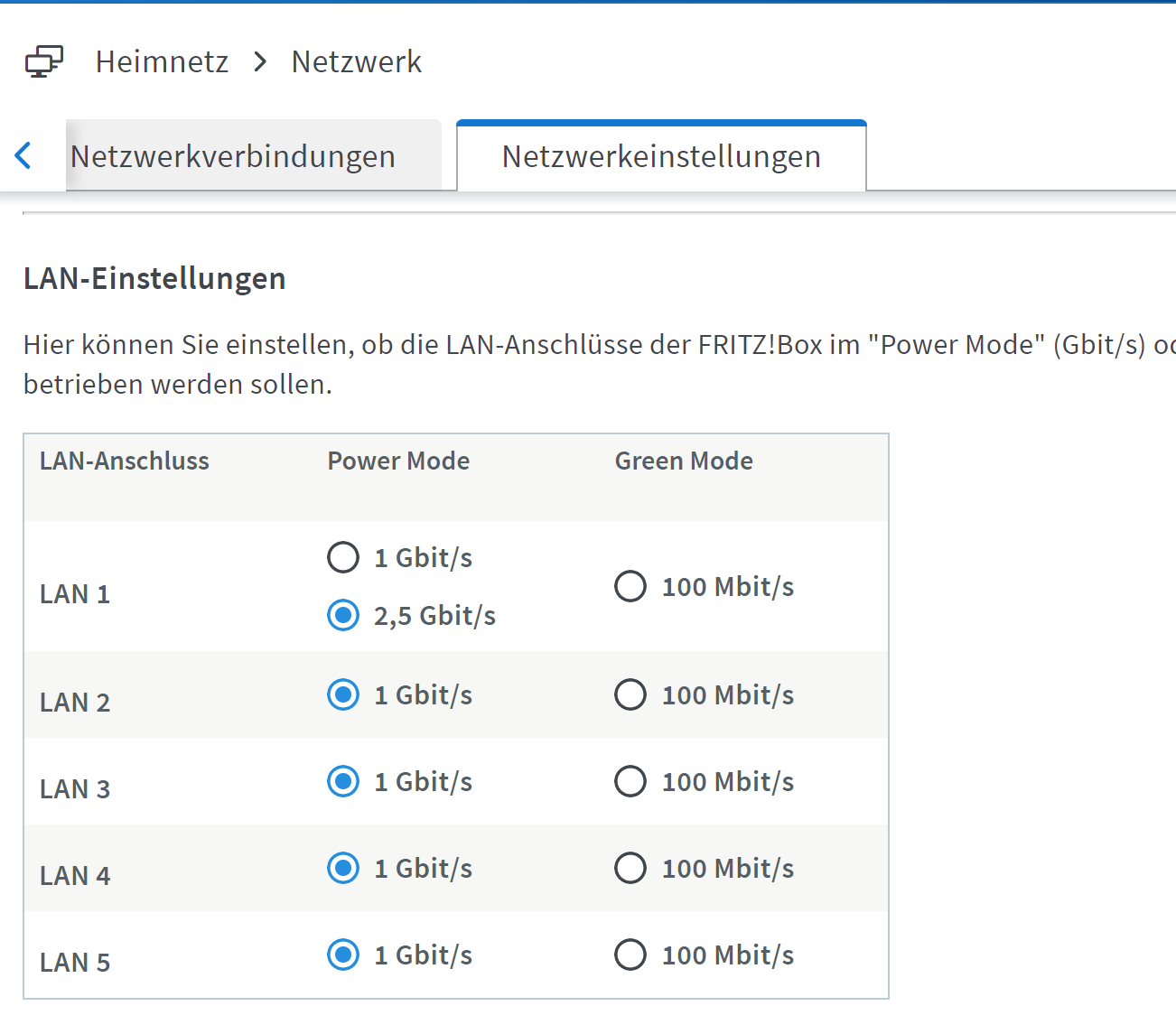 Bei meiner Fritte sind 2 LAN-Ports immer auf 1Gb/s und da gibt's keine Probleme. Die bleiben auf 1Gb/s.
