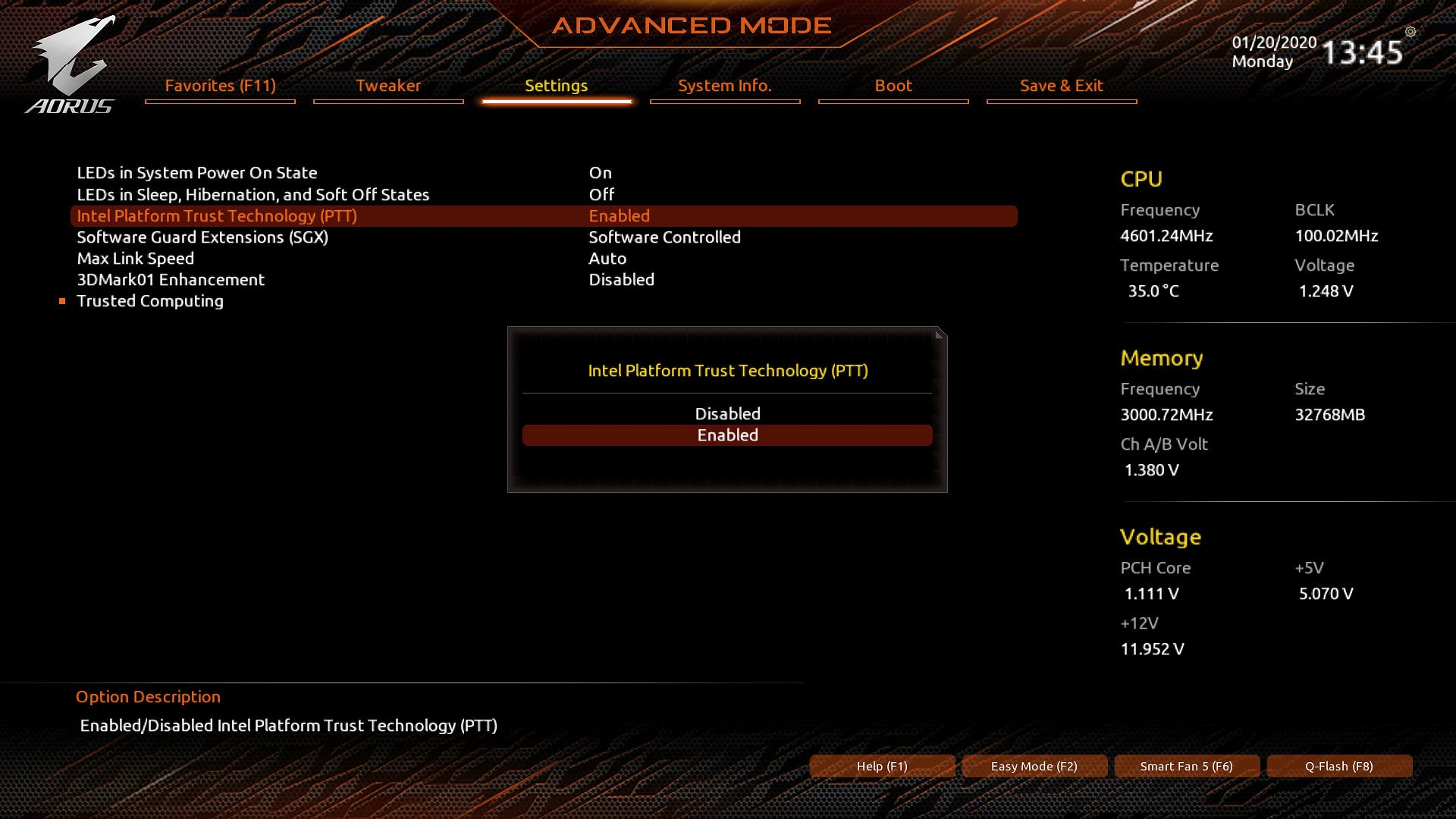 Ggf. muss bei "Trusted Computing Enables or disables Trusted Platform Module (TPM)." noch zwischen Discrete TPM und Intel PPT zusätzlich umgeschaltet werden