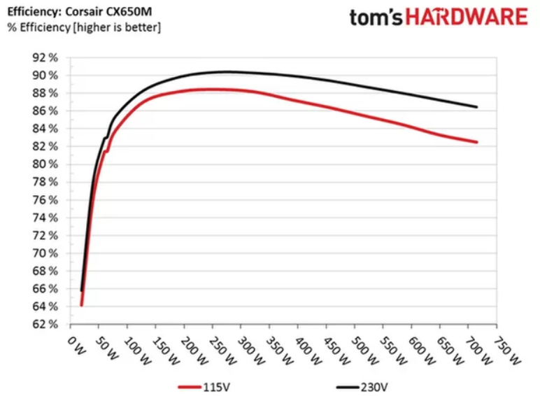 Bei einem CX550W läge die Effizienz bei 200W bei ca. 88%. Wenn dein System also 200W braucht zieht das Netzteil 228W.
