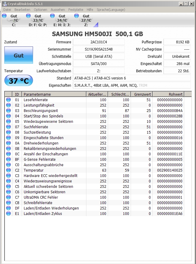 Poste bitte mal den Screen von CrystalDiskInfo, ziehe aber bitte das Fenster soweit auf, dass alle Attribute und auch die Hex-Werte bzw. Rohwerte vollständig sichtbar sind.