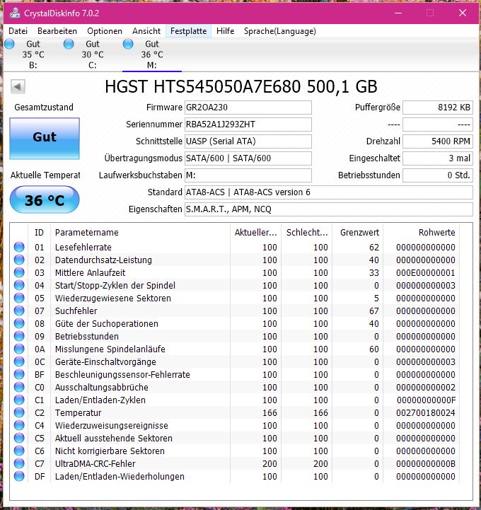 Im Anhang findet ihr ein Screenshot von der CrystalDiskInfo-Auswertung. Es scheint alles in Ordnung zu sein laut SMART.