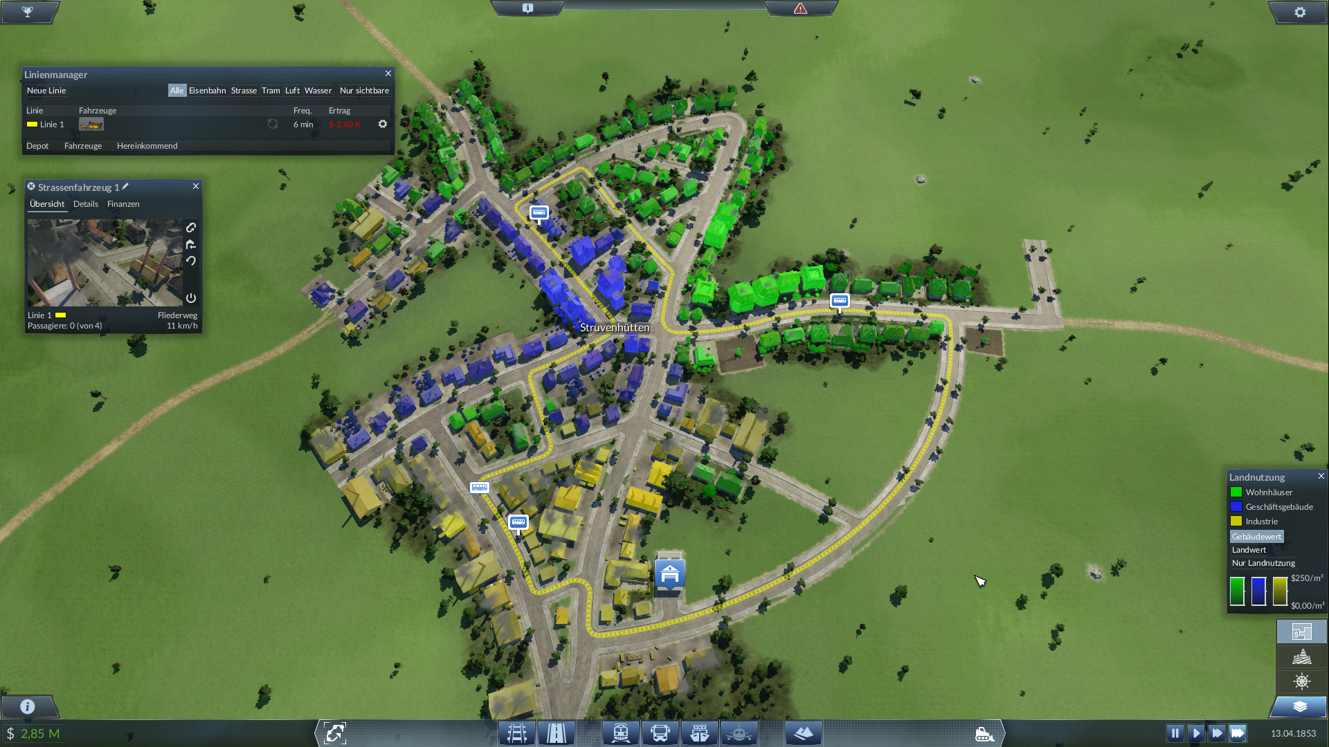 Neues Spiel ab 1900 begonnen, 2 Haltestellen hingestellt (von Stadtgröße und Aufbau fast wie die von 1850), nach kurzer Zeit "warteten" dort die Fahrgäste und fuhren mit...