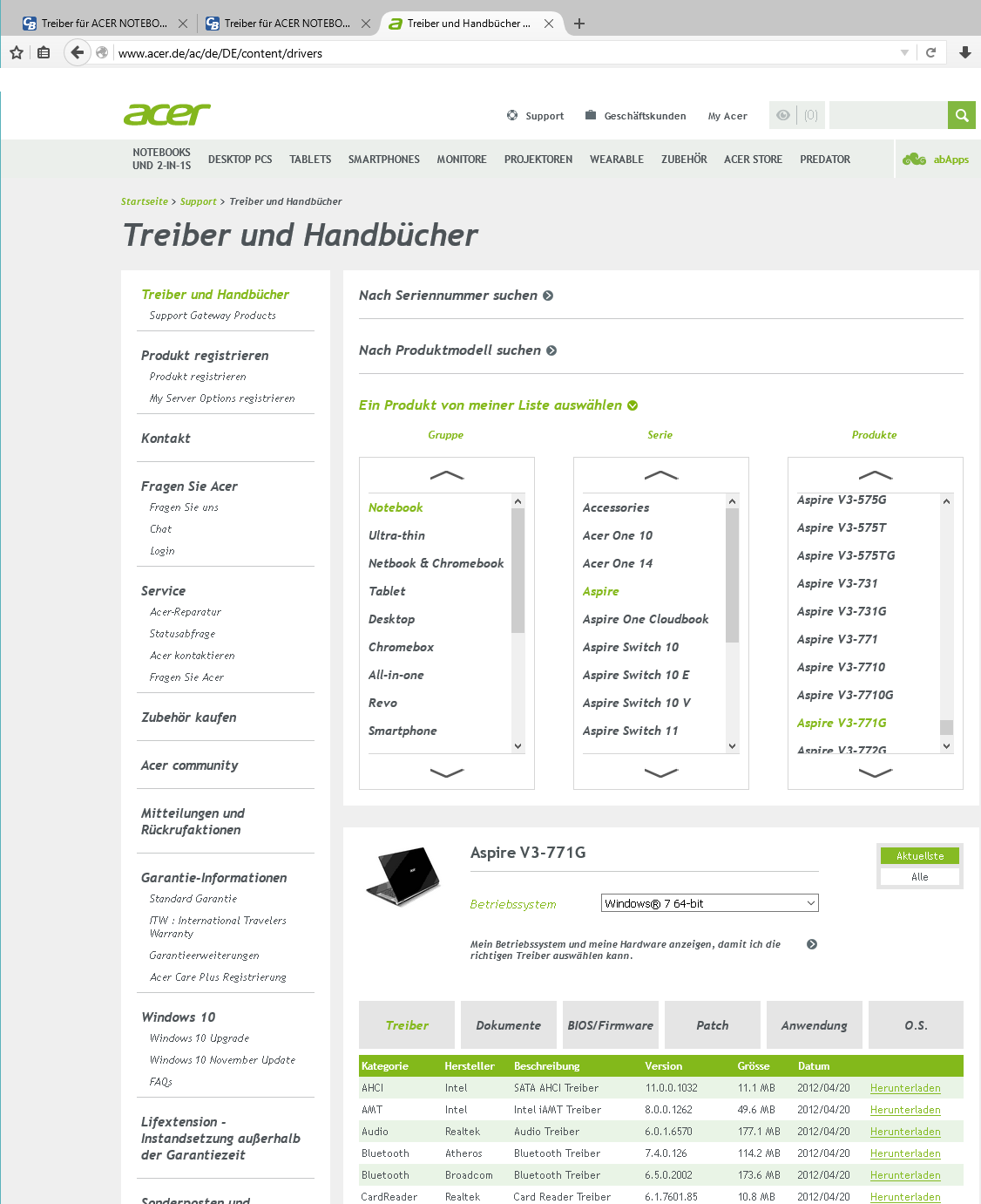 Wo es die Treiber für das/ dein Notebook gibt, siehe Screenshot der Acer-Webseite mit URL oben in der URL-Leiste und alles andere was du für die Treibersuche auswählen musst ist grün.