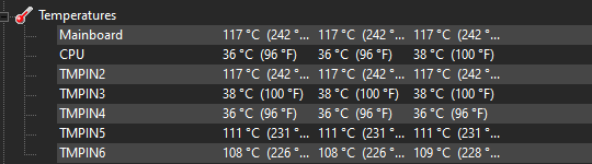 Könnte es sein das der PC denkt er würde überhitzen? Bei HWMonitor steht ja das Mainboard dauerhaft auf 117 Grad.