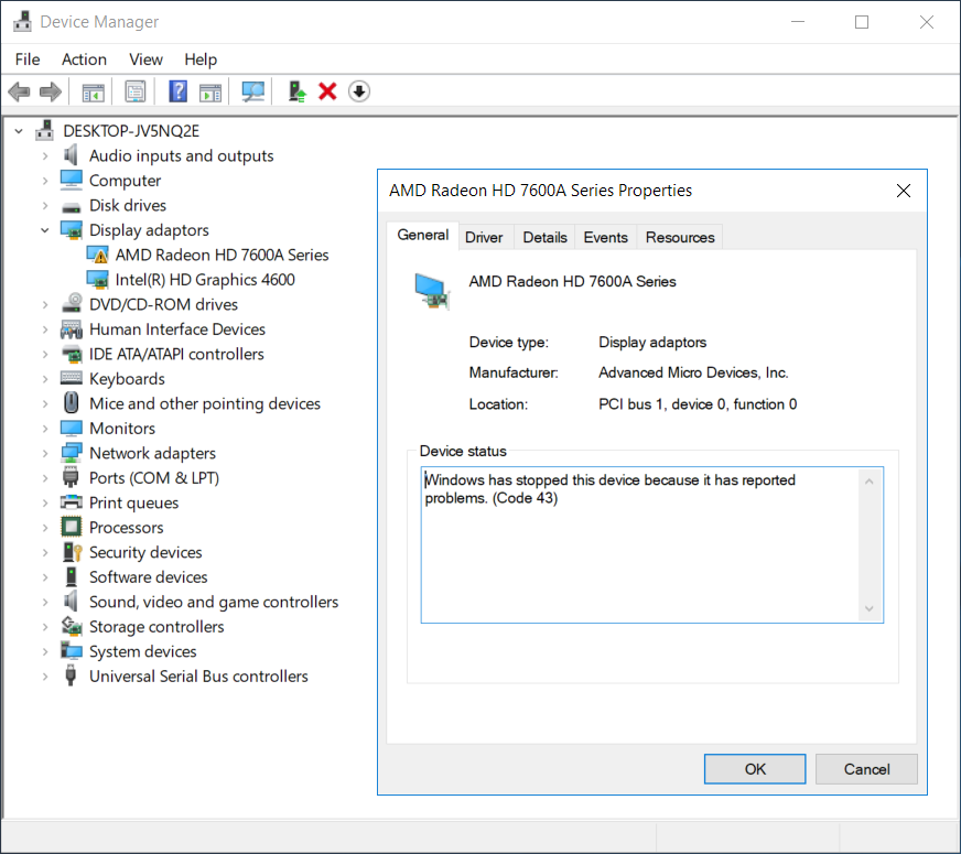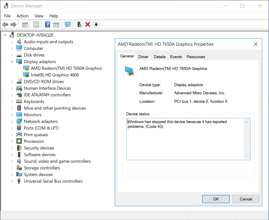 "Windows has stopped this device because it has reported problems. (Code 43)"