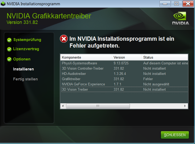 Ich habe vor ein paar Tagen den neuen Treiber von Nvidia runtergeladen (377.88) und versucht ihn zu installieren. Dies hat leider nicht funktioniert und es wurde nur "Fehler" hinter dem Grafiktreiber-Reiter angezeigt. Daraufhin habe ich die alten Treiber deinstalliert und es nochmals versucht. Wieder das selbe Problem.