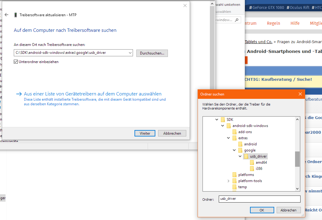 Ich will für mein Nexus 5x Treiber installieren (hat schon bei vorherigen Smartphones nicht geklappt). Im Gerätemanager seh ich ein MTP Device, klicke auf "Auf dem Computer nach Treibersoftware suchen" und wähle dann den Google Treiber Ordner.