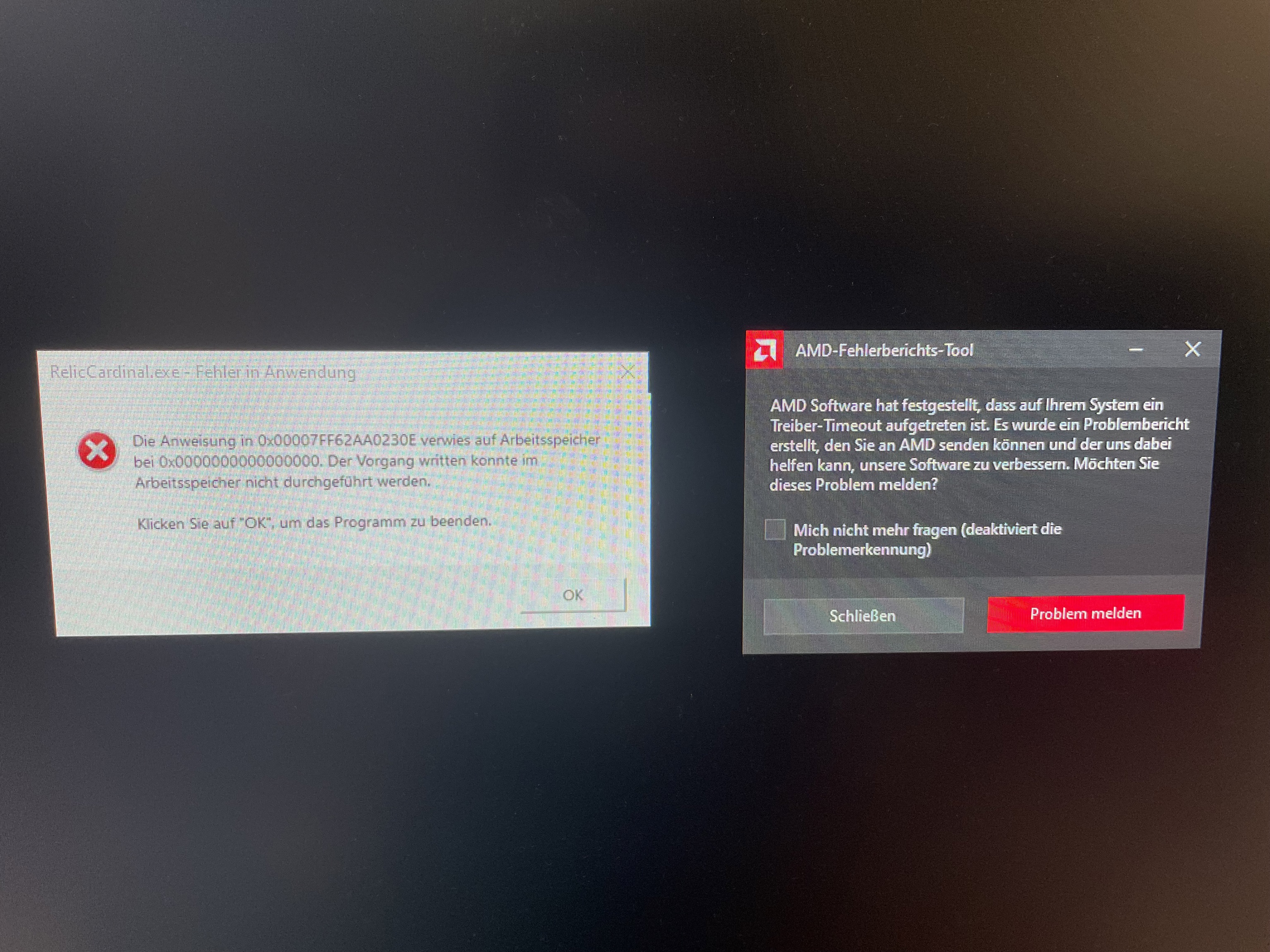 leider hatte ich jetzt öfters die Fehlermeldung Treiber Time Out. Die ersten 4 Mal hatte ich nur eine Meldung von AMD und jetzt noch die andere Meldung, dass etwas mit dem Arbeitsspeicher nicht in Ordnung sei.