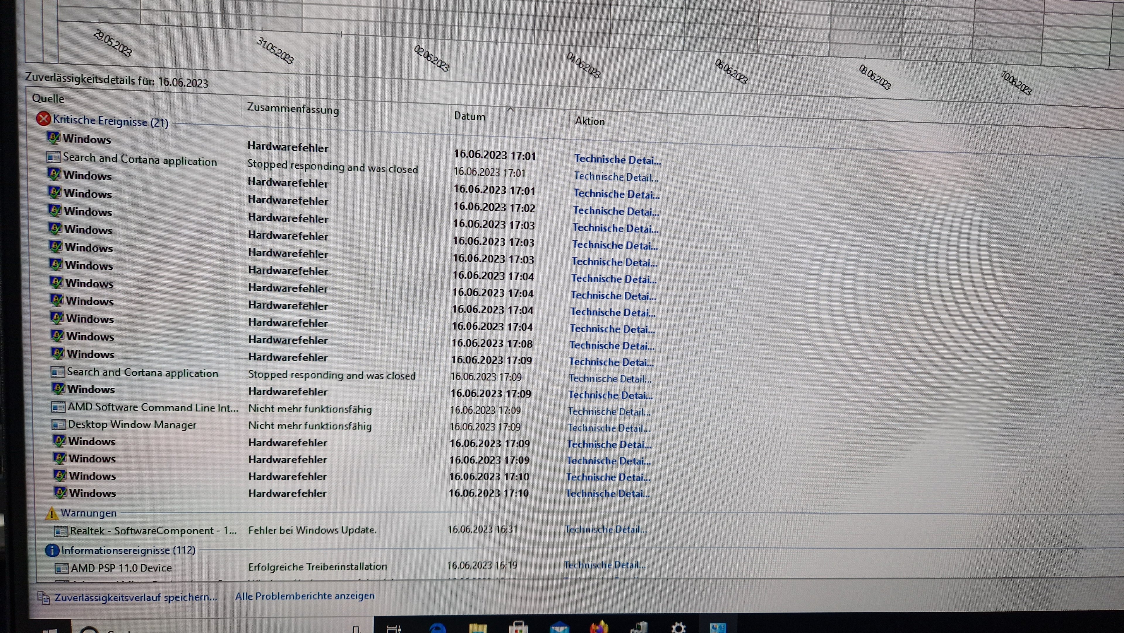 Im Zuverlässigkeitsverlauf gibt es Einträge, habe ich hier mal als Bild eingefügt.