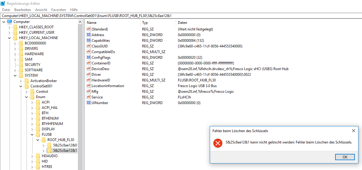 Den Treiber bin ich jetzt losgeworden durch löschen einiger Dateien aus dem Registrierungs-Editor. Aber wieso lässt sich dieser Eintrag nicht löschen?