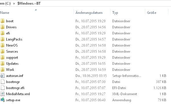 Im Windows-Explorer ist dann auch der Ordner $Windows.~BT zu sehen.