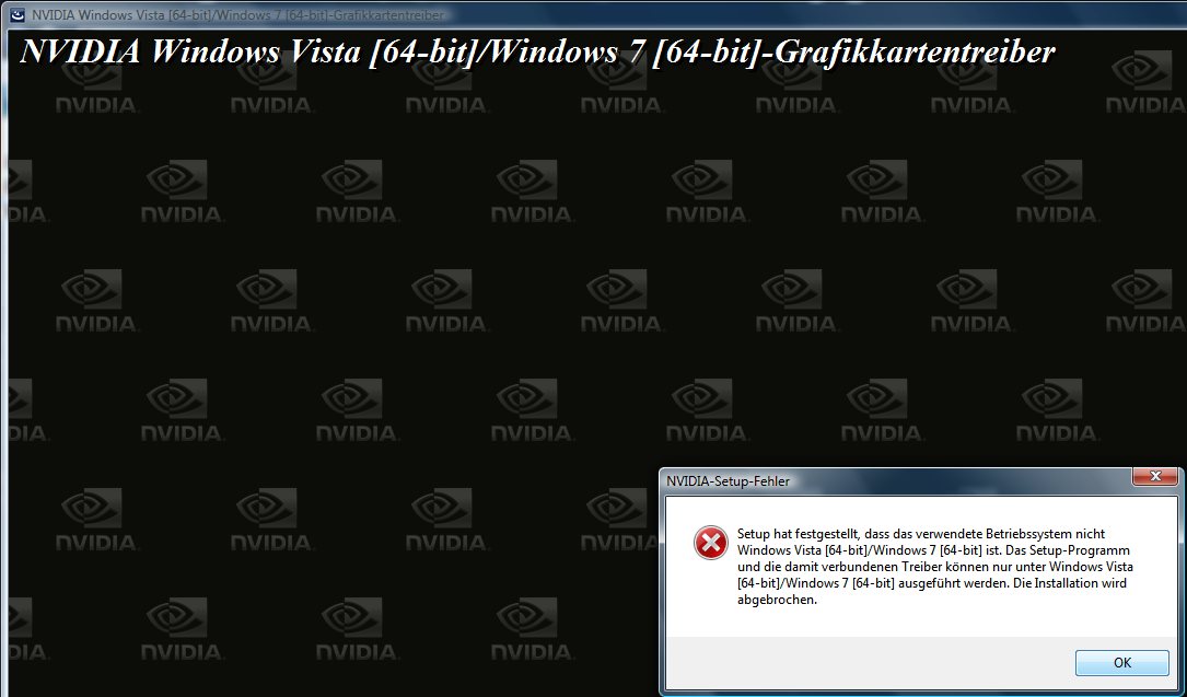 Ich wollte vorhin den neuen Beta Treiber 195.81 installieren, also deinstallierte ich wie üblich alle NVidia Einträge im Progammmenü und zu guter Letzt einmal den Driver Sweeper drüber laufen lassen, danach Neustart und dann wollte ich den neuen Treiber aufsetzen, aber die Installation wird abgebrochen, weil der Treiber der Ansicht ist, ich fahre ein x86 BS?