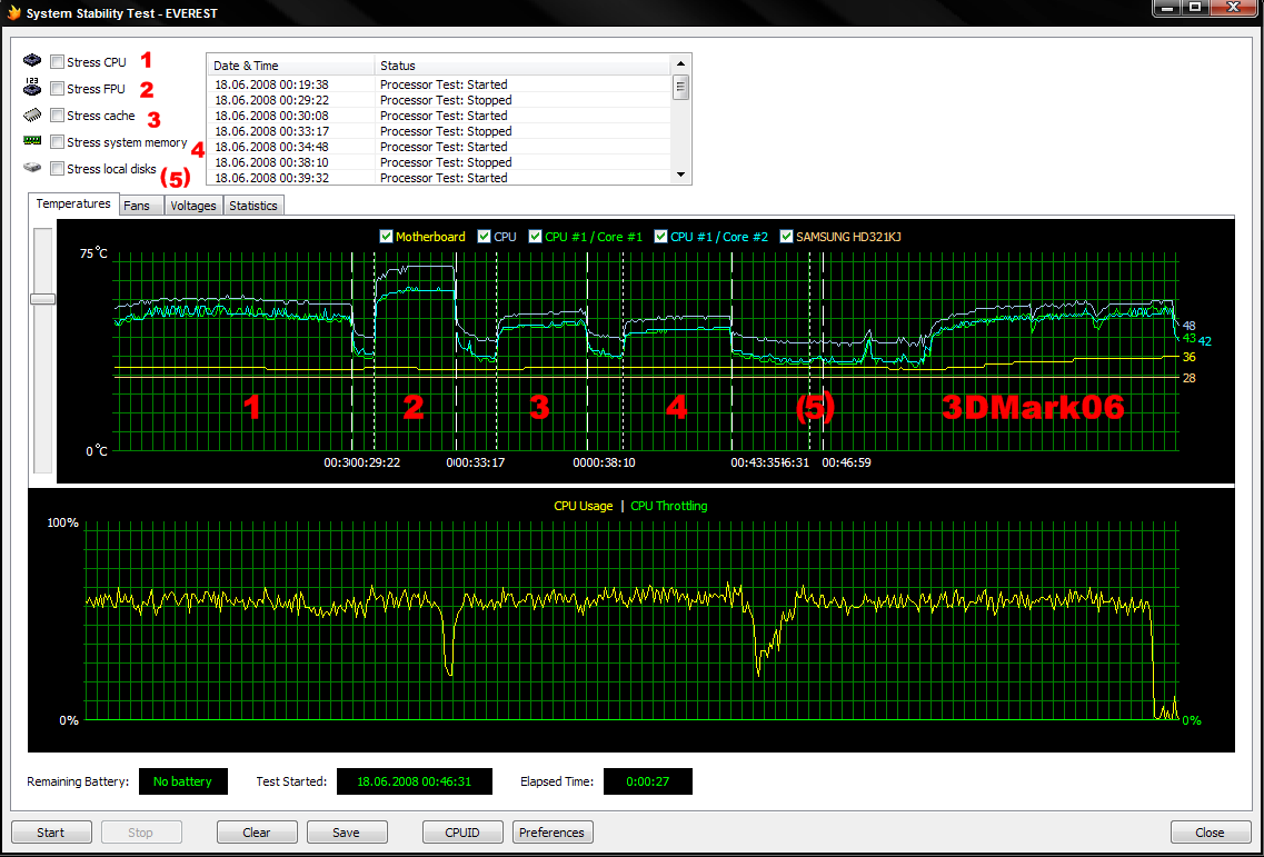 Dem angehängten Pics könnt ihr die Graphen entnehmen. Den 5. Test. HDD Belastung hab ich nur ganz kurz ausgeführt...war egtl. sinnlos. Am Ende habe ich 3DMark06 kurz laufen gelassen, um das gesamte System zu belasten um die Relation feststellen zu können.