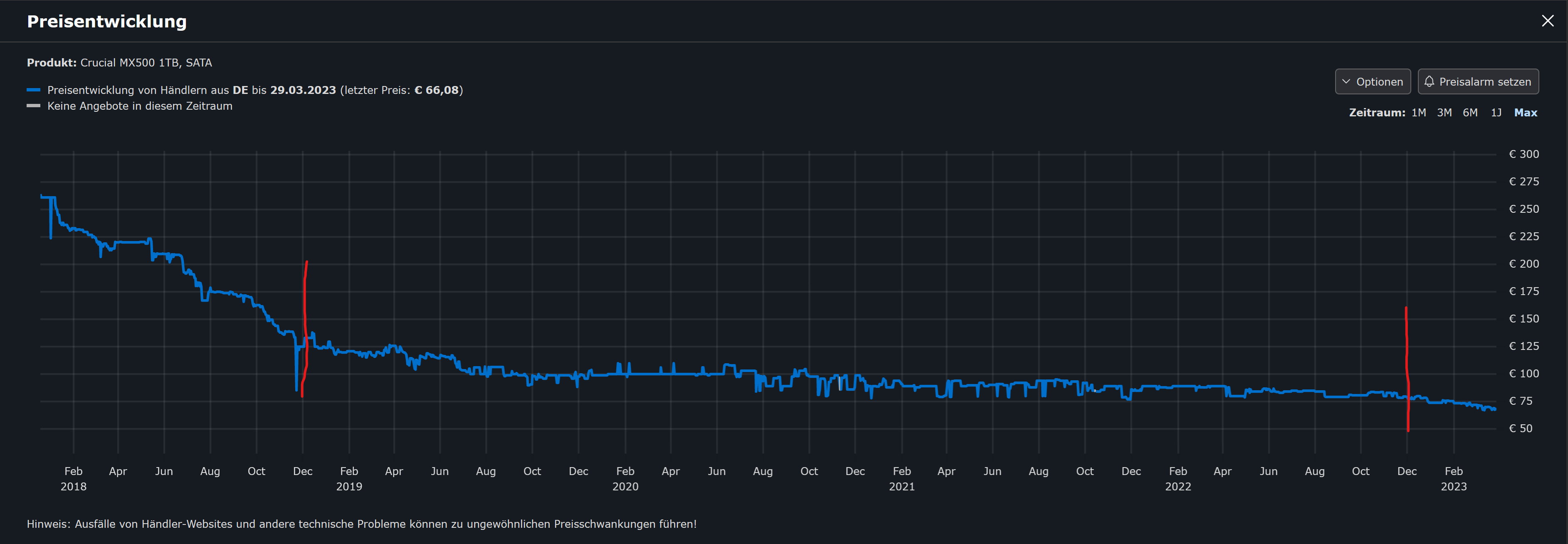 Das wäre ausgezeichnet. Wobei ich in der letzte Woche beobachtet habe, dass die Preise wieder leicht angezogen haben (2TB SSDs paar Euro rauf, 64GB DDR5 ~10 Eur rauf).