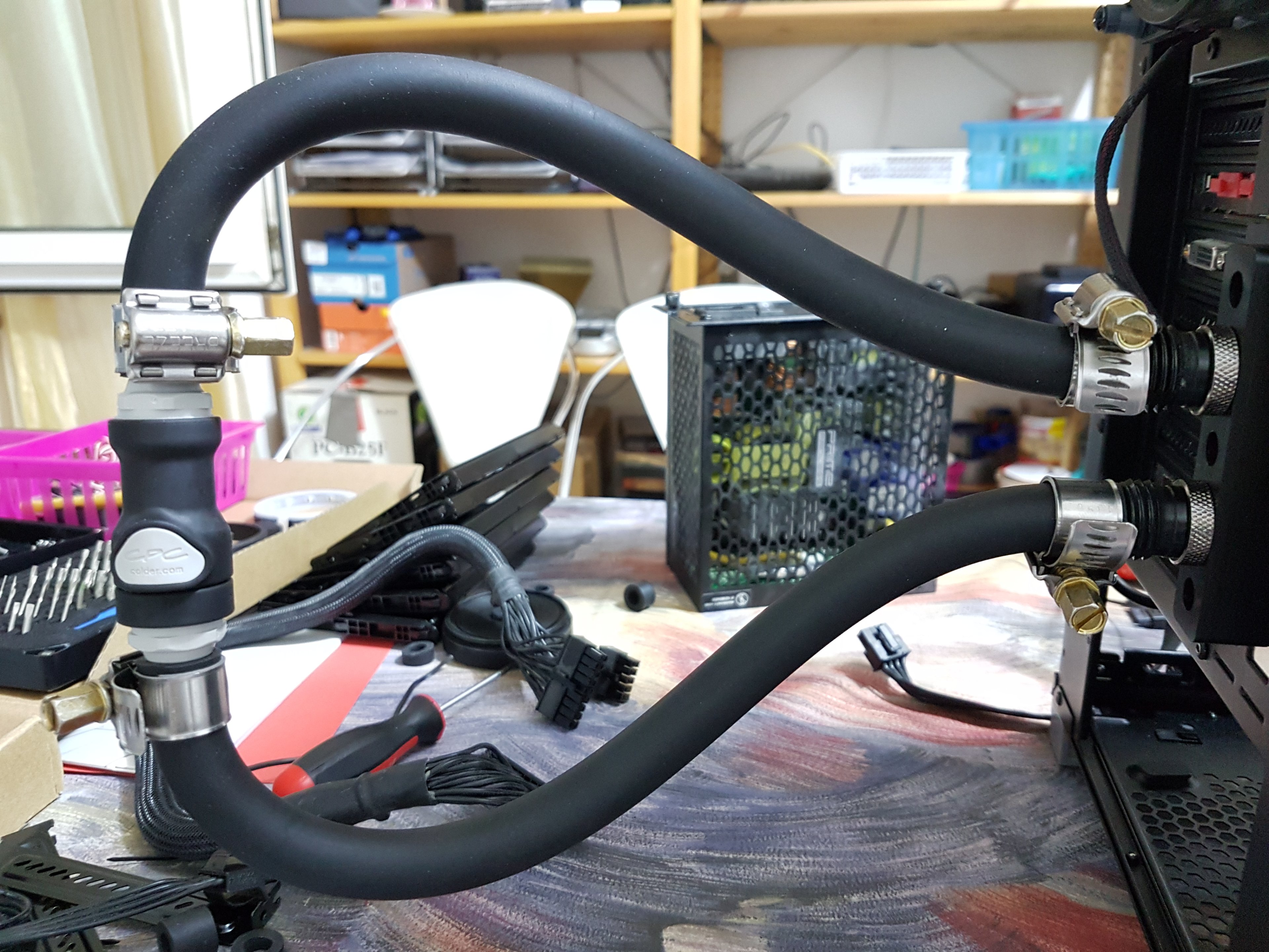 - der PC soll mit seinem Front Radi weiterhin autark einsetzbar sein, also stumpf gedacht die Schnellkupplungen hinterm PC zu einem "U" verschließen, Hardware auf Eco Profil stellen und Abfahrt