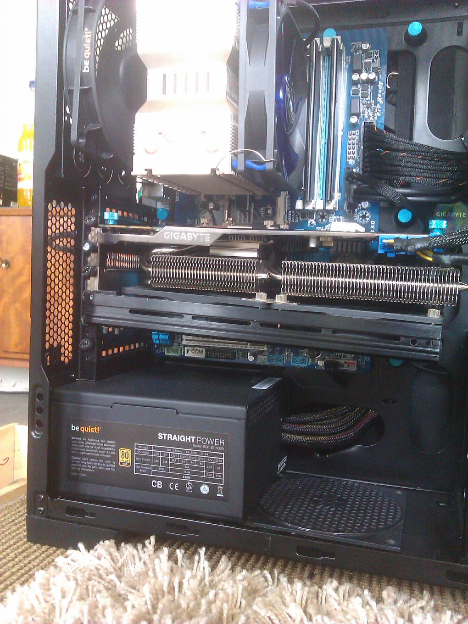 Auf dem Bild schwer zu erkennen, aber natürlich ist genug Platzt für die Lufter der Grafikkarte, um überhaupt Luft ein zu saugen :-) und an den PCI-Slots wäre genug Platz um einen herauspustenden zu installieren.