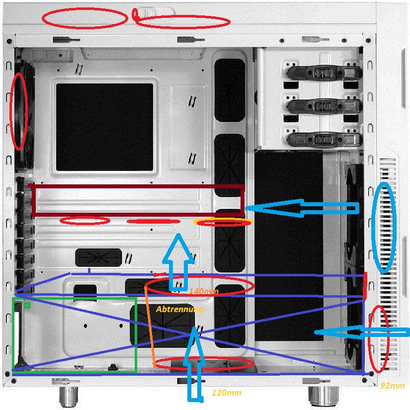 Ein anderer 120er oder 92er der von der rechten Seite in der Zwischenwand, also da wo auch der Front 120er im normalem Gehäuse sitzt, dafür sorgt, das sich die Luft nicht unbedingt dann in der Zwischenwand staut.
