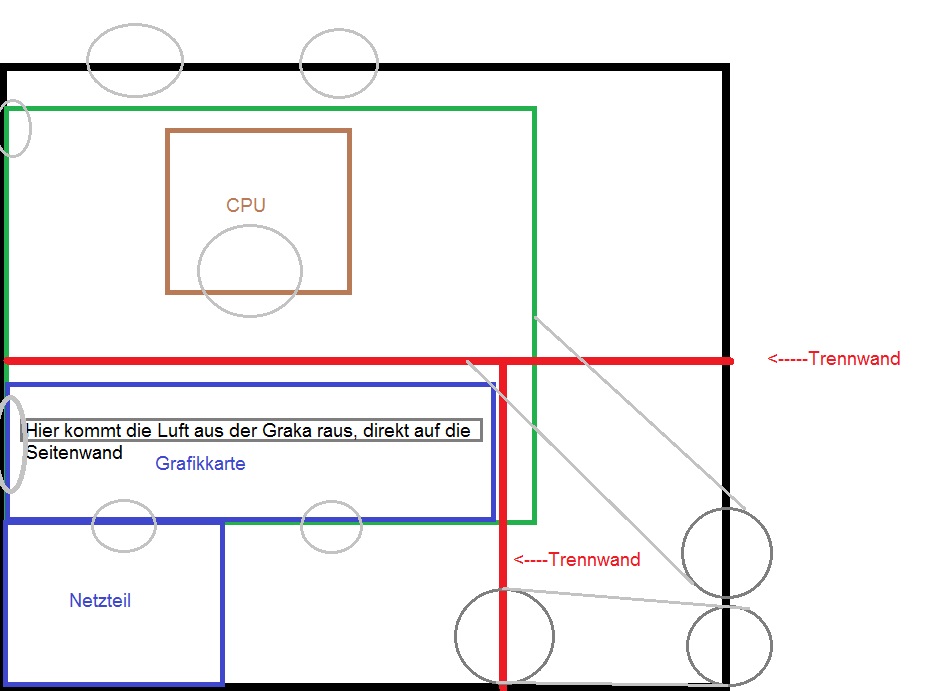Die Grafikkarte zieht die kalte Luft von unten und pustet sie leider seitlich raus. Also seitlich gegen die Gehäusewand. Das erwärmt meine CPU aber ungemein, weil der AMD-Kühlkörper nicht gedreht werden kann und der Lüfter die warme Luft genau einsaugt.