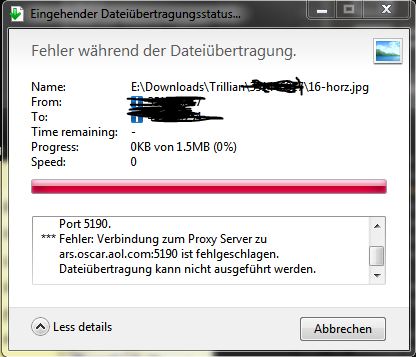ich wollte euch mal fragen ob ihr mir sagen könnt woran es liegen kann, dass die Dateiübtragung über Trillian bei mir nur sehr selten klappt und wie ich das mache das es möglichst immer klappt ich bekomme immer dieses Fehlermeldung: