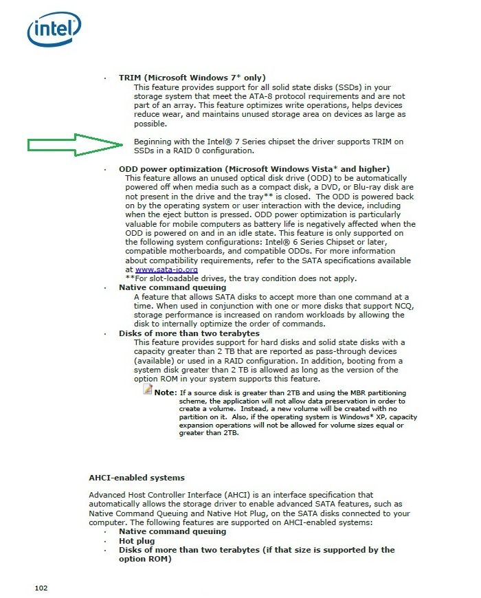 Dies TRIM funktioniert nun im RAID mit zb. 2 SSD welche als Raid0 laufen beim 7'er Chipsatz wie diesem zb. Z77 mit WIN 7 und dem RST ab Version 11.xxxx + dem dazugehörigen RAID-ROM.