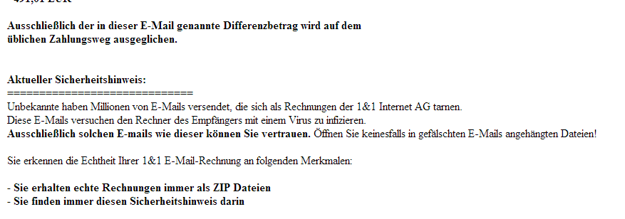 Heute morgen ist wieder eine der 1&1 Rechnungen reingeflattert. Imo brandgefährlich ist der Hinweis in der Mail, das es böse Buben mit gefälschten 1&1 Mails gibt, aber diese Mail von den Guten kommt und Rechnungen immer in ZIP- Dateien gesendet werden. F-Secure hat die Mail kassiert. Dabei bin ich gar kein 1&1 Kunde...
